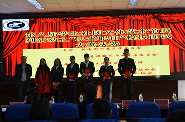 通过初赛的选拔,共有8名选手脱颖而出,登上了决赛的舞台。决赛现场,各位选手用风趣幽默的语言以及内容丰富的ppt进行了简单的自我介绍,个人意向行业以及自己未来蓝图的勾画,让现场的观众对自己有了初步认识。然后由评委老师进行专业点评和现场问答。期间,张丽经理指出了在模拟面试中职业倾向、个人简历、企业面试中存在的问题;陈怀玺书记则表示,在大学的四年里,我们不仅要注重知识的积累,还要积累一些实践经验。最后,经过激烈的选拔,宁夏大学土木与水利工程学院的缑晓飞获得了一等奖,宁夏大学农学院的马志保和葡萄酒学院的柴源源获得了二等奖,宁夏司法警官学院的张鹏等5名同学获得了三等奖。